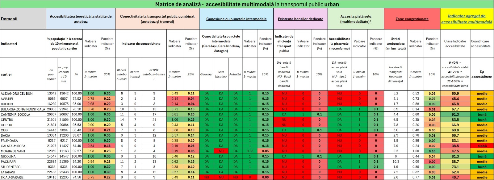 Pentru fiecare indicator, s-a stabilit o pondere de influență, în funcție de importanța sa pentru mobilitate. Pe baza acestor ponderi, s-a calculat un scor final de accesibilitate multimodală, exprimat procentual, care a permis clasificarea cartierelor în trei categorii: