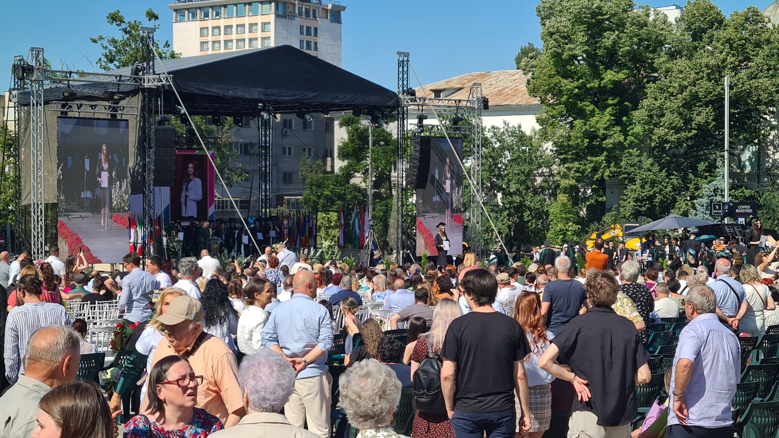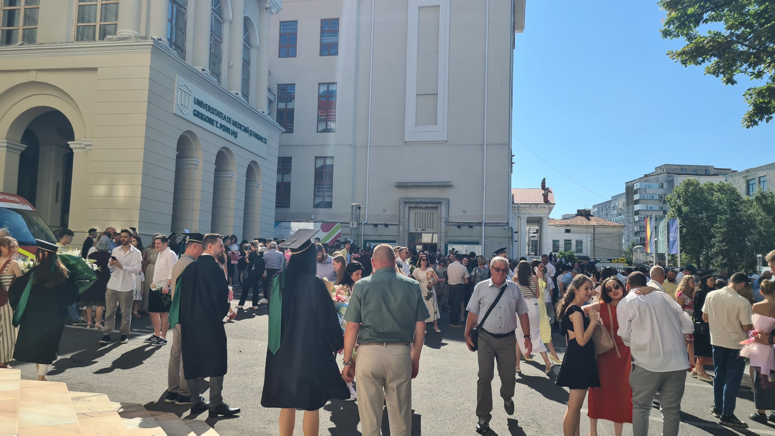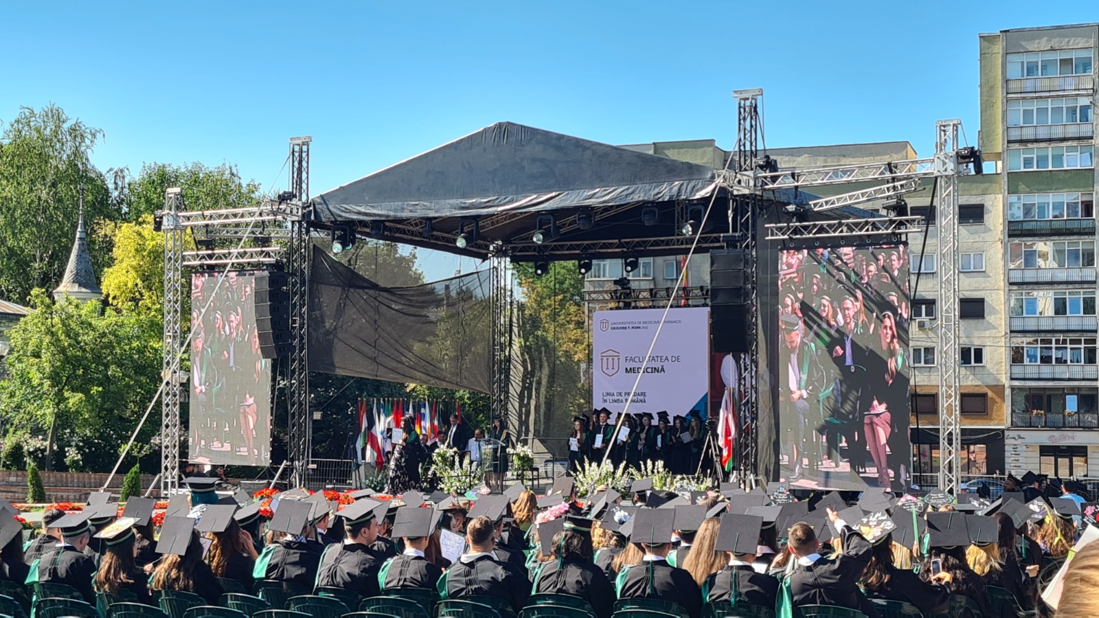 Părinți, bunici, frați, surori, soți și soții, copii și prieteni – toți s-au adunat în fața universității, într-un decor festiv care a marcat unul dintre cele mai importante momente din viața unui tânăr: absolvirea. Scena a fost amplasată cu fața spre clădirea UMF, iar într-o parte au fost pregătite scaune pentru invitați, care i-au susținut cu aplauze și lacrimi pe absolvenții cu robe negre, toci și eșarfe verzi – culoarea-simbol a instituției.