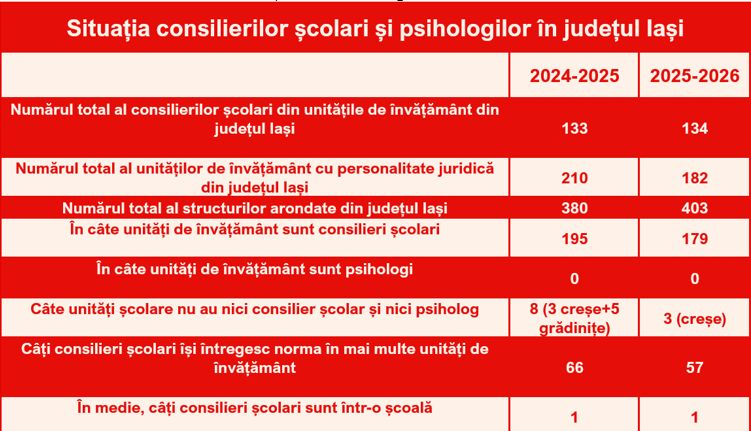 Nu există niciun psiholog în școlile din județul Iași, fie ele în mediul rural sau urban. Reprezentanții Centrului de Resurse și Asistență Educațională (CJRAE) Iași au transmis pentru „Ziarul de Iași” că, în medie, există un consilier școlar în fiecare unitate de învățământ. Realitatea este că acel consilier se împarte între cel puțin două școli, de unul singur. Șefa CJRAE Iași, Anca Hardulea, a precizat că, dintre celelalte județe din România, la CJRAE Galați sunt psihologi angajați, la sediu, dar nu știe dacă aceștia merg și în școli.