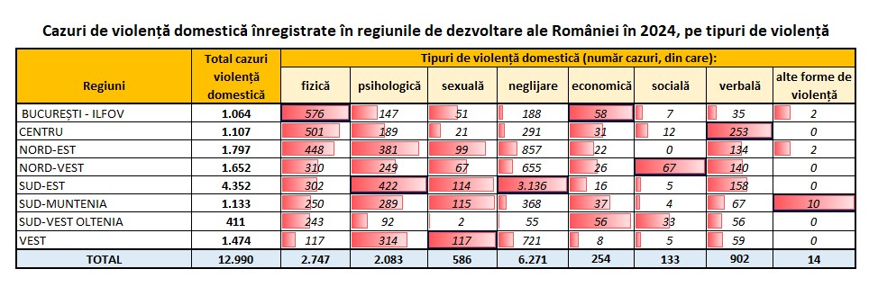 Cea mai răspândită formă de violență din România a fost neglijarea, o formă de abuz mai puțin vizibilă, dar cu efecte profunde asupra sănătății emoționale și fizice a victimelor. Cu peste 6.200 de cazuri raportate, acest tip de violență domestică domină statisticile, urmată de violența fizică, care a afectat peste 2.700 de persoane. Violența psihologică se menține la un nivel îngrijorător, cu peste 2.000 de cazuri, în timp ce violența sexuală, deși mai puțin frecventă în raportările oficiale, a fost prezentă în aproape 600 de situații.