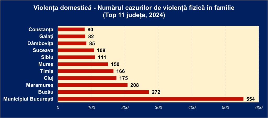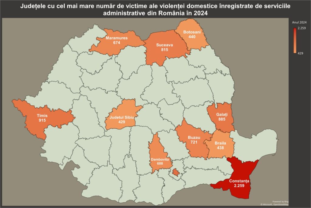 La nivelul țării, Constanța s-a detașat ca județul cu cele mai multe victime înregistrate, peste 2.200, adică mai mult decât dublu față de București, unde au fost raportate 1.002 cazuri. Capitala, cu populația ei mult mai numeroasă, oferă prin comparație o imagine paradoxală, sugerând fie o reticență mai mare a victimelor de a apela la instituții, fie o subraportare sistematică.