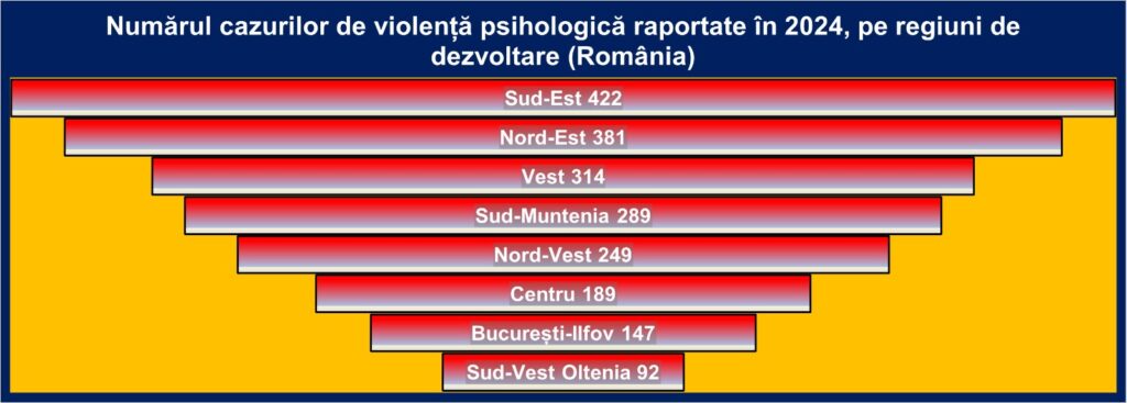 Violența psihologică este greu de recunoscut, dar extrem de frecventă. Se manifestă prin control excesiv, amenințări, gelozie obsesivă, supraveghere, apeluri insistente. În 2024, au fost raportate peste 2.000 de cazuri. Galațiul conducea cu 230 de cazuri, urmat de Botoșani (134), București (130), Dâmbovița (126) și Cluj (118).