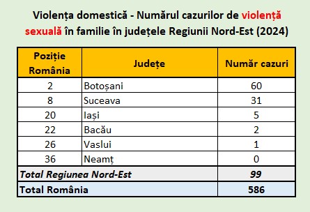 Violența sexuală aduce o traumă dublă, fizică și emoțională. Include hărțuirea, manipularea, relațiile sexuale forțate, chiar și în cadrul căsniciei. În 2024, au fost raportate 586 de cazuri. Argeșul a fost județulcu cele mai multe cazuri de acest tip (15% din total), urmat de Botoșani (60), Brăila (56), București (51), Hunedoara (48), Timiș (46), Constanța (36), Suceava (31). În Nord-Est, 92% din cazuri proveneau din Botoșani și Suceava.