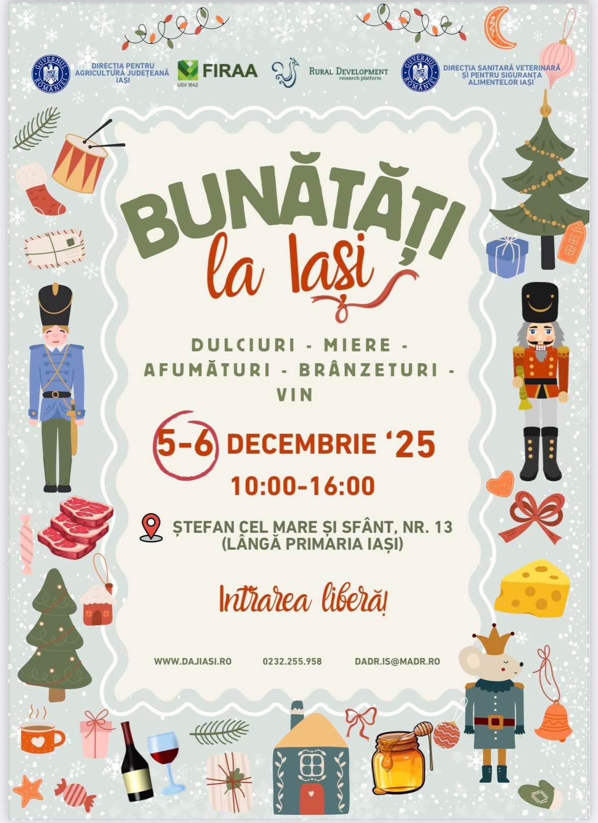 Iașul se pregătește pentru un eveniment care va aduce atmosfera sărbătorilor direct în centrul orașului. Direcția pentru Agricultură Județeană Iași, alături de partenerii FIRAA – USV Iași, Rural Development Research Platform și Direcția Sanitară Veterinară și pentru Siguranța Alimentelor Iași, organizează în perioada 5–6 decembrie târgul de iarnă „Bunătăți la Iași”.